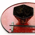 光が当たると、あわび貝が虹色に輝き、漆の黒がその光を引き締めますので、派手な印象は受けません。