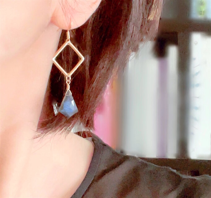ダイヤ型のラブラドライトの揺れるピアスです。