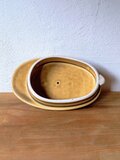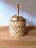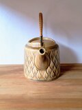 ポットの表面全体に施された木の葉(リーフ)モチーフのレリーフは、光の加減で陰影が生まれ、まるで深い森の木々を思わせる立体的な表情を見せてくれます。温かみのあるイエローブラウンの釉薬は、日本の木製の家具や、素朴な陶器とも相性が良く、どんな空間にも自然に溶け込む懐の深さを持っています。