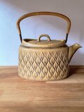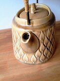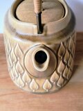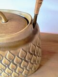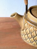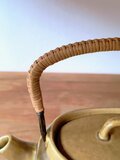 特筆すべきは、持ち手にあしらわれた籐(ラタン)のハンドルです。熱いポットを持つ実用性はもちろん、この天然素材の柔らかな曲線が、陶器の素朴な質感と見事に調和し、全体に優しい雰囲気を加えています。