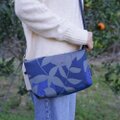 カラーは夜空をイメージしたミッドナイトブルーと絶妙なグレー!明るさのあるブルーから深いブルーが重なる様は、美しい夜空そのもの。葉っぱの重なりから空を見上げたテキスタイルです。