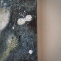 木製パネルにテクスチャーをつけ、アクリル絵の具やオイルパステル等を使用しています。