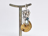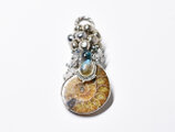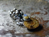 アンモナイトと繊細シルバー装飾ラブラドライト、たわわな鈴とラブラドライト&ムーンストーン&ハーキマーダイヤモンド、インディゴブルービーズを繋いだペンダントトップです。