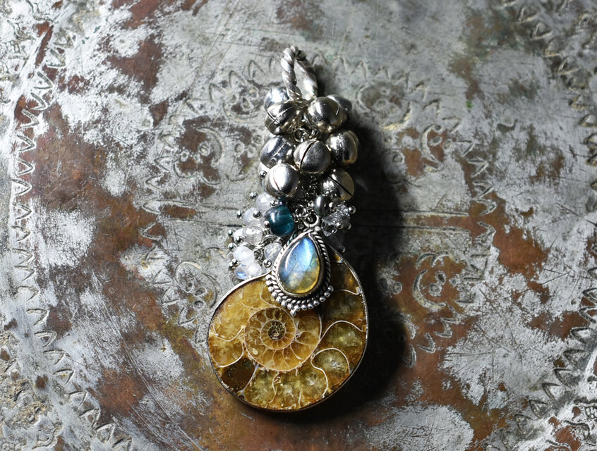アンモナイトとシルバー装飾ラブラドライト、たわわな鈴とストーンビーズ、インディゴブルービーズのペンダントトップ