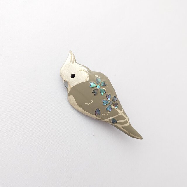 見返りオカメインコ(銀)桜螺鈿 漆ブローチ