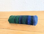 よこ糸には紺色をメインに青色から黄緑色の糸を入れて横じま織ってます。