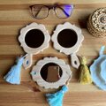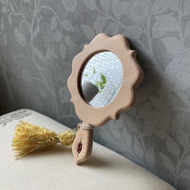 天然木を手作業で磨き上げ、中央には小さな鏡とラインストーンを挟み込んでいます。