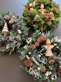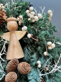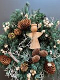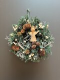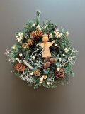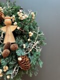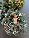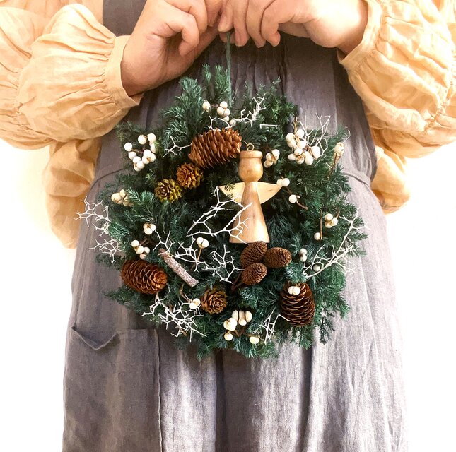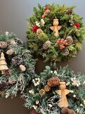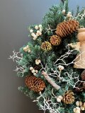 ヒムロスギをベースに、白い枝とナンキンハゼをあわせたシンプルなイメージのリースです。まるで森の中の自然をそのままあつめたナチュラルなイメージに仕上げました。木製のオーナメントもかわいらしく、フカフカのグリーンとマッチします。喧騒から少し離れて、ゆったりとした時間を過ごしたい大人のクリスマスはいかがですか。