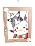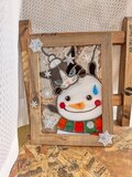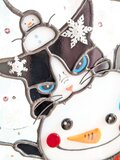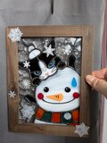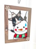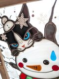 あまりの寒さに雪だるまに噛みついている猫さんをステンドグラスで作りました。