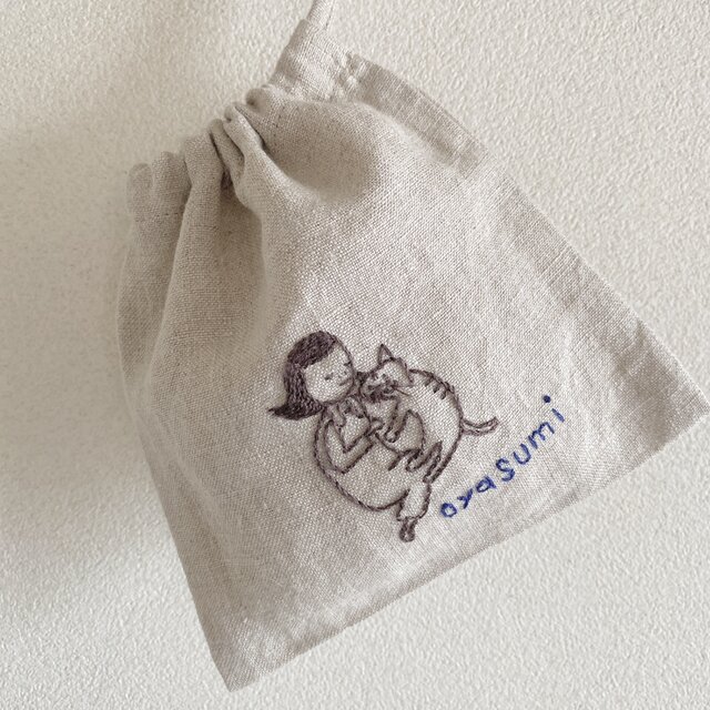 女の子とネコちゃんの優しい絵柄の表情に、ほっこりした気持ちになります…♪ かわいらしい巾着、ありがとうございました! また素敵な刺繍を楽しみにしております(^^)