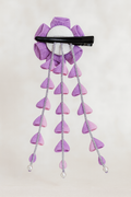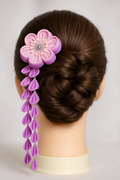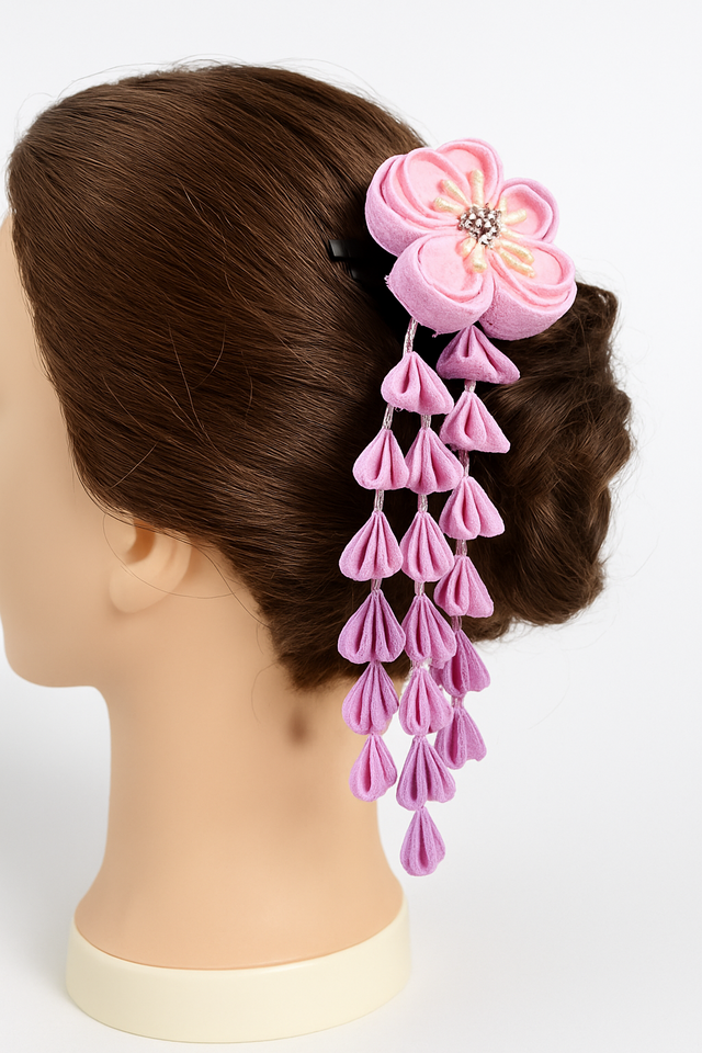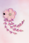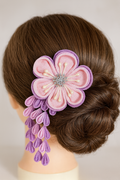 This elegant tsumami-zaiku hair ornament features soft shades of pink and lavender, crafted with traditional Japanese techniques.