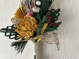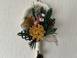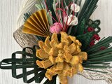 籐で編んだ松・紅白の梅・菊・竹・千両をアレンジして飾っています。