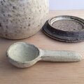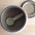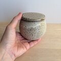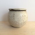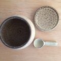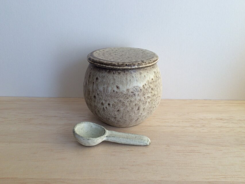 黒荒土製。中に納めて蓋をしていただくこともできるさじ付きです。塩や砂糖を入れてご使用ください。