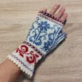 手の甲部分の模様は、ノルウェーのセルブーミトンの図案を参考に、青いお花を編み込みました。