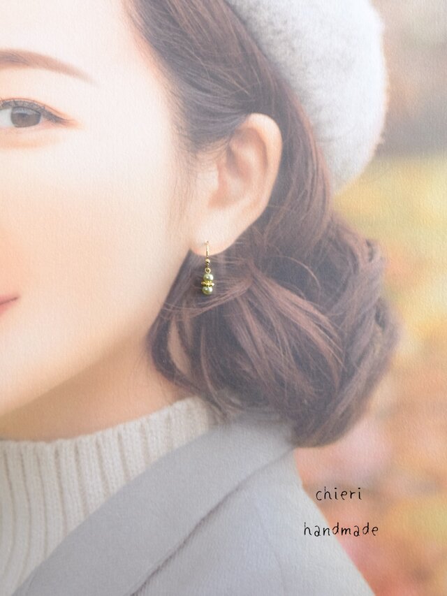 耳元で小さく揺れ、ゴールド色のビーズを間にサンドイッチしているので高級感も出しています。