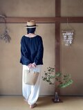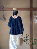 ダブルガーゼのゆったりオーバーサイズのフリルブラウス。ブラックは夏でも涼しく着られるよう、以前のナチュラルカラーより首周りを一回り大きくワイドラウンドネックに仕上げました。冬はインナーにタートルネックなども着ていただけます。後ろのシェル(貝)ボタンはしっとりとした上品な輝き。オールシーズン使えるブラックカラーをお楽しみください。