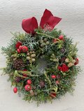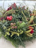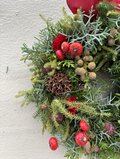 多種の針葉樹とつぶつぶのバーゼリアをいっぱい、アクセントにローズヒップとケイトウで華やかなリースに仕上げました。