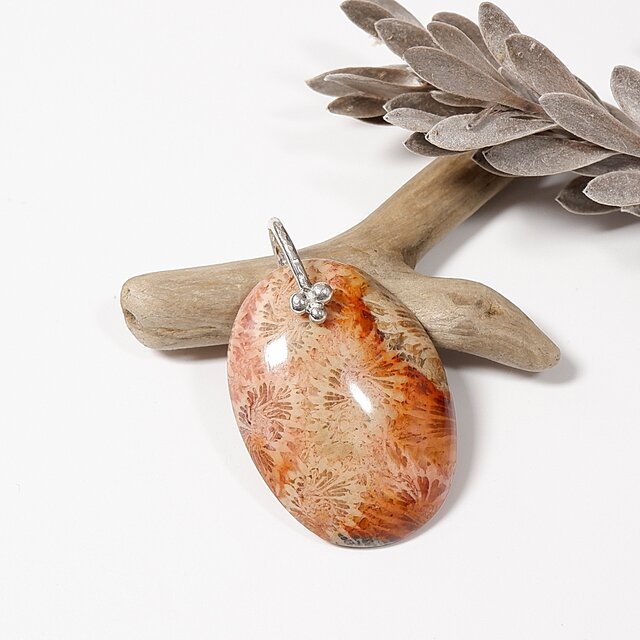 花のような模様の美しいフォッシルコーラルをシルバーのバチカンでシンプルなペンダントに仕上げました。