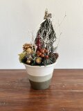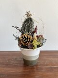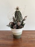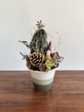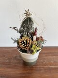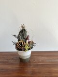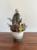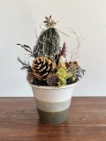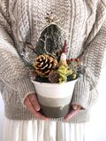 サンタクロースがふだん暮らしている様子はどんなだろう?そんなことを想像していたら、トナカイと仲良く森を散歩する姿が浮かんできました。クリスマスツリーや大きなマツボックリなどクリスマスらしいモチーフでできたポットアレンジメント。テーブルに1つあるとなんだかそれだけで幸せな気持ちになれそうです。