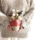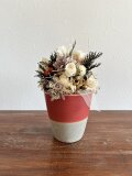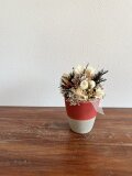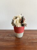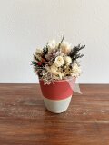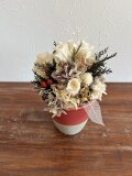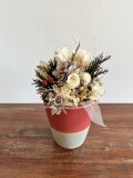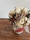 マツカサや白い小枝などクリスマスらしいモチーフの中に、白いバラを入れたちょっと特別なポットアレンジメント。テーブルに1つあるとなんだかそれだけで幸せな気持ちになれそうです。