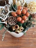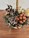 マツカサや白い枝など、クリスマスらしいモチーフでできたポットアレンジメント。テーブルに1つあるとなんだかそれだけで幸せな気持ちになれそうです。