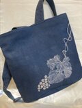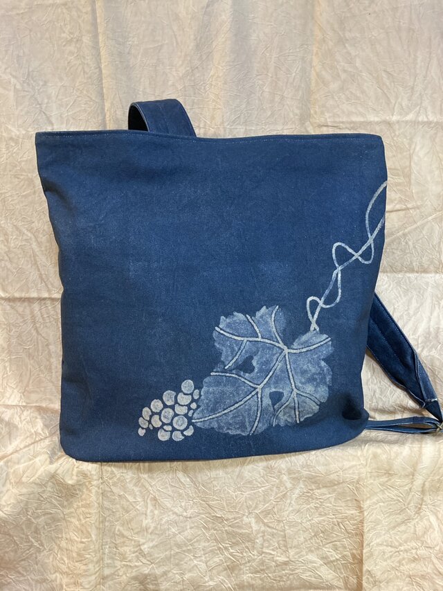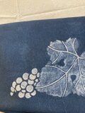 上質な綿100%帆布の生地に藍を引き染めし、のり染めにてぶどう模様を描きました。