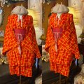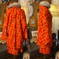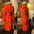 【 着物リメイクミニミディワンピース アンサンブル 帯サッシュベルト付き 和洋折衷 ハンドメイド レトロ 古着 朱赤×菜の花イエローの“かすれ格子 aKW-103】