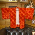艶やかな朱赤地に、菜の花色のラインが迷路のように重なるレトロ格子。筆先で掠れたような表現がヴィンテージ感を添え、着るだけでパッと灯りがともる主役柄です。帯サッシュベルトは差し色の臙脂サッシュに淡桃のタッセル紐を合わせ、ウエストをきゅっと引き締めます。ベレーやローファー、ブーツとも好相性。観劇やお出かけ、撮影会まで映える、和洋ミックスの一点物セットです。