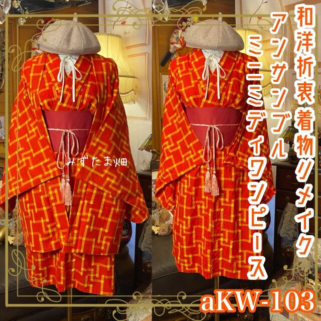 着物リメイクミニミディワンピース アンサンブル 帯サッシュベルト付き 和洋折衷 ハンドメイド レトロ 古着 aKW-103