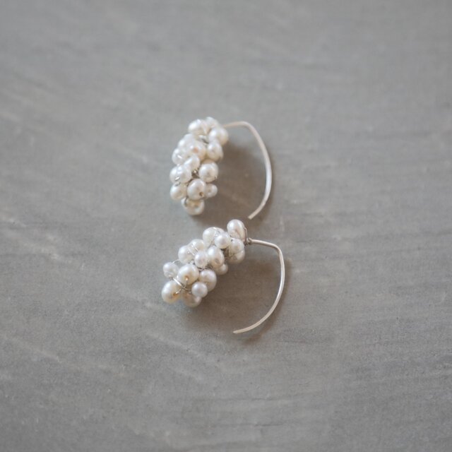 小さな淡水パールの粒が連なる、上品で落ち着いた印象のシルバーピアスです。