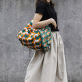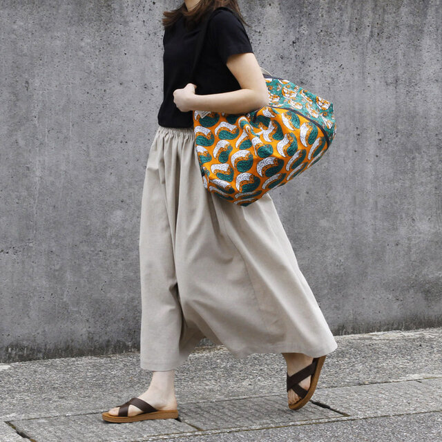 アフリカ布「カンガ」の魅力に実用性を備えたバッグです。裏地に帆布を合わせた丈夫な作りで、荷物を出すと八角形の形になって折りたたむことも可能です。