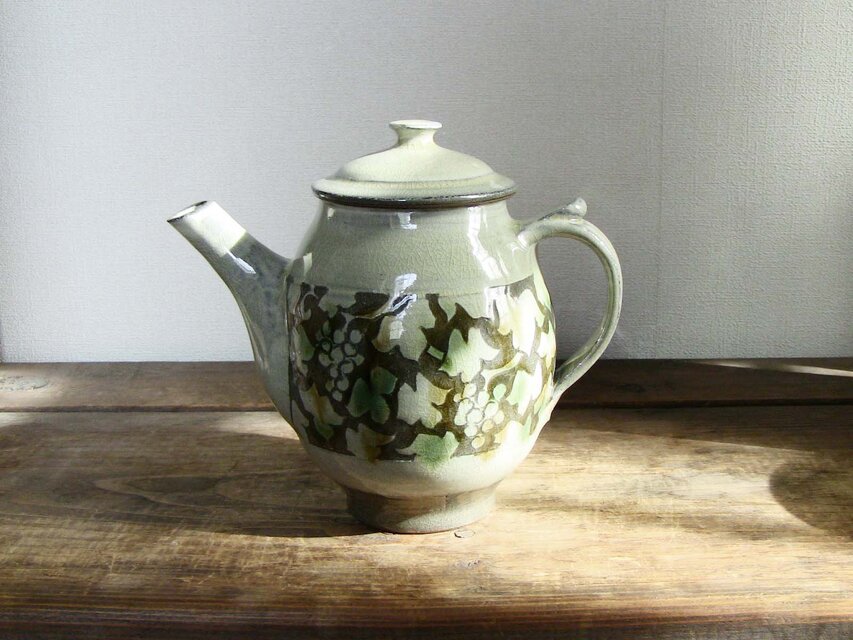 ポット全体に化粧泥を掛け葡萄を描いてから、余分な化粧泥は削り落として図柄だけを残しています。