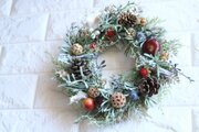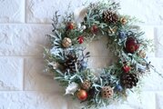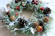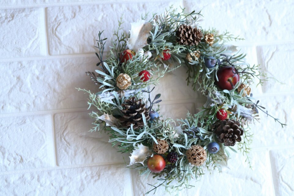 松ぼっくりやりんご、実ものやヒイラギなど、他グリーンをたっぷり使った上品な冬のクリスマスリースが出来上がりました。