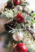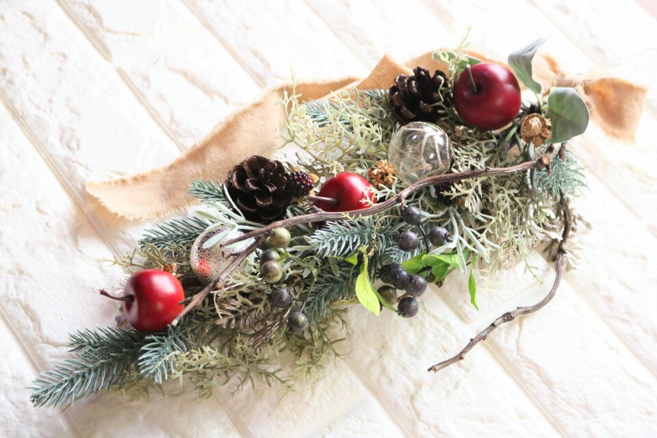 モミやグリーンをたっぷり、そしてりんご、松ぼっくりなどを入れおごそかなクリスマススワッグが出来上がりました。