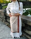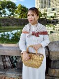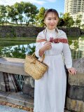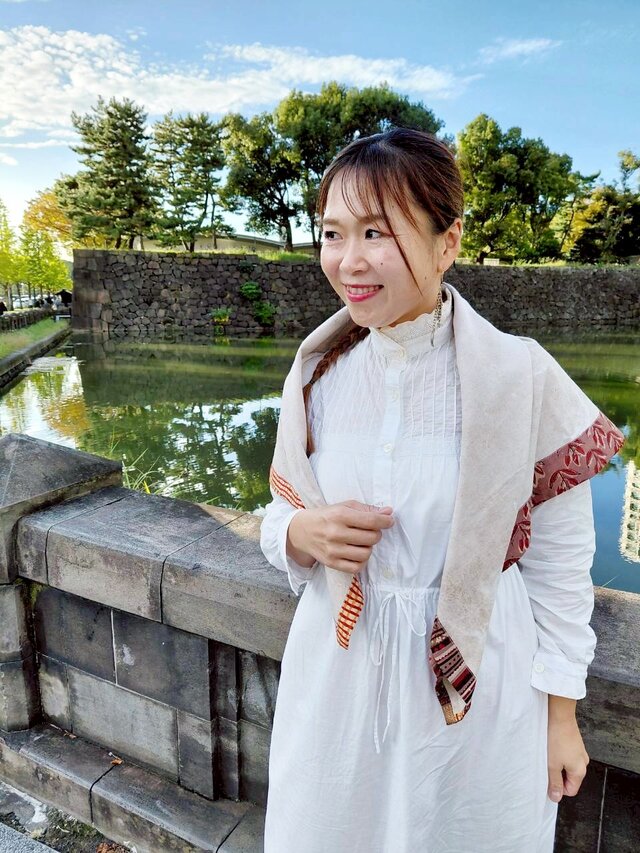 写真はワンピースで合わせていますが、ニットやシャツを着てパンツを履いた時に肩にかけたり、腰に巻いても素敵ですよ。