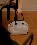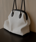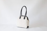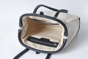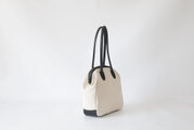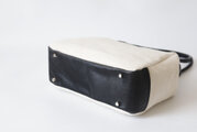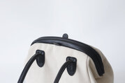 今回は綿花の色味そのもまの「キナリ」を使用しています。繊維が長く丈夫な”コーマ糸”を、貴重な織機で丁寧に織った耳付きの一級品です。ひと目ひと目に強い凹凸とうなりを感じる、風合い豊かな自然素材。帆布の上に細かい黒いポイントがはっきり見えるが、これは汚れではなく、元の生地における