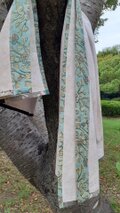 端を花柄や植物柄のグリーンや黒色の草木染めのブロックプリントの生地で囲んでいます□きれいな色です。