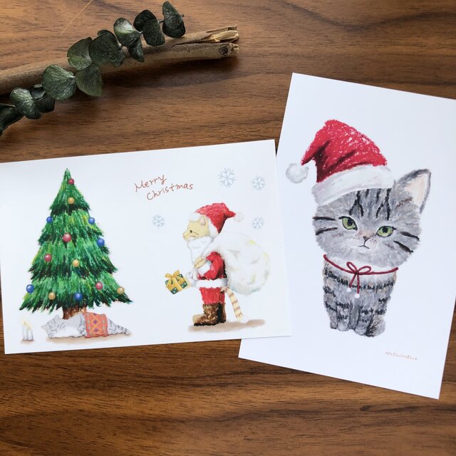 クリスマスと猫をモチーフに描いたポストカード2枚セットです♪