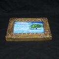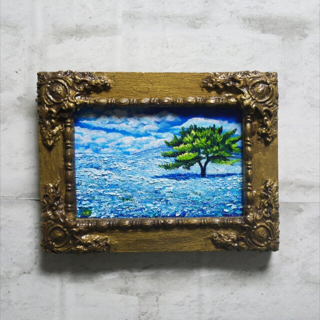「ネモフィラの丘」は、国営ひたち海浜公園に広がる青いネモフィラ畑を描いた特別な油絵作品です。この美しい風景は、爽やかな青空と柔らかな雲、そして一面に広がる青いネモフィラ畑が調和し、見る人に癒しと心の安らぎをもたらします。右側には一本の木が優雅に佇み、自然の美しさを一層引き立てています。豪華なアンティークライトゴールドの額縁が、この作品にエレガントな雰囲気を添え、どんなインテリアにも調和します。