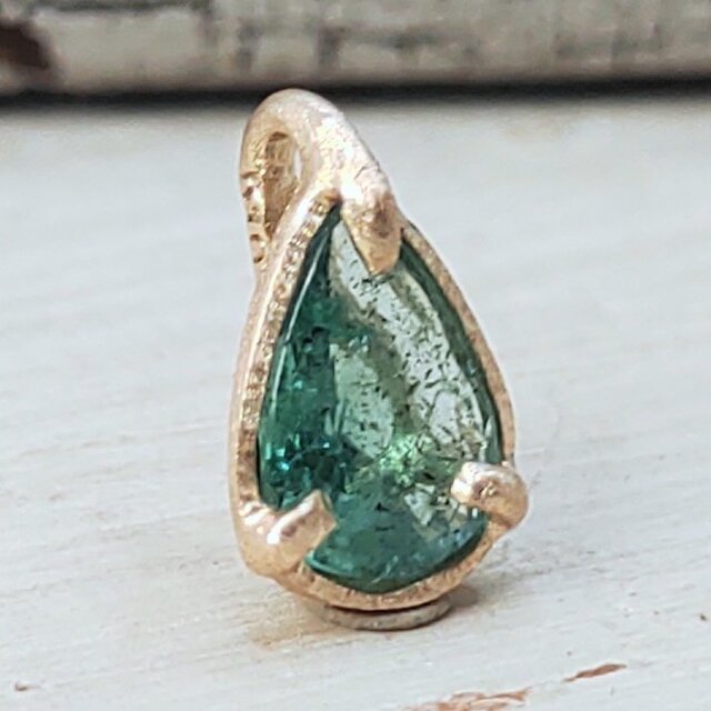 明るくネオン味のあるグリーンとハンドメイドで生み出したアンティークテイストの組み合わせが個性的な煌めきを放ちます*特有のクラックがありますが秀逸な煌めきのザンビア産エメラルドをお楽しみ下さい*台座はテクスチャーを施したアンティーク調マット仕上げ、チェーンからルースが下に離れ過ぎないようバチカンをルース裏まで延ばしたクラフト感ある手作り金具です*こちらはトップのみの販売です(チェーン金具ダルマ板3.5㎜まで通過可能、画像参考チェーン14kgf 1.4㎜幅)