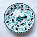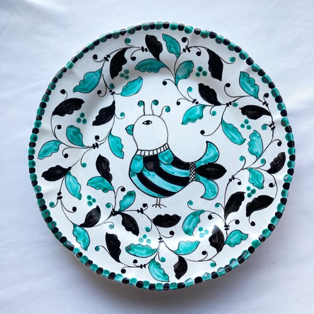 黒褐色とグリーン(酸化銅)で描いた高貴な鳥と植物模様のディナー皿。
