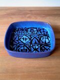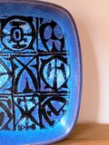 このスクエアトレイの魅力は、何と言ってもその鮮やかな青い釉薬と、力強い抽象的なパターンにあります。