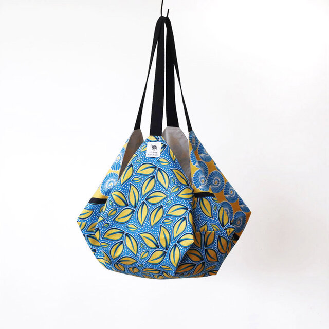 アフリカ布「カンガ」の魅力に実用性を備えたバッグです。裏地に帆布を合わせた丈夫な作りで、荷物を出すと八角形の形になって折りたたむことも可能です。