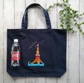 瀬戸大橋と猫の刺繍 大きい丈夫なトートバッグ 生成り 帆布 コットン 広いマチ オーダーメイド リピ様割引き