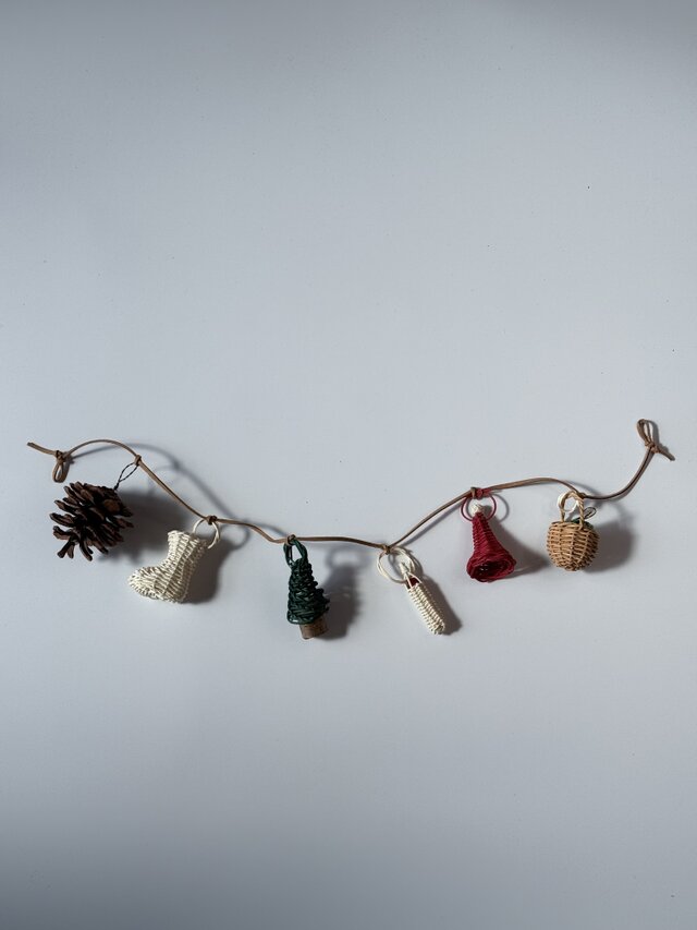 細い籐で編んだ小さなオーナメントをつなげてガーランドにしました。