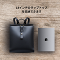 A4サイズの書類や14インチノートPCも収納可能。内ポケットにはスマートフォンや小物類をすっきりと整理できます。開口部はベルト留め仕様で、程よいホールド感とクラシックな印象を両立しています。