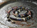 楕円型のビーズはアフリカから届いたブラスビーズです。その他にも古いネックレスに使われていたメタルパーツを散りばめました。