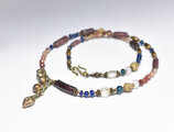 アフガンパーツ&民族鈴、ローマングラスとボヘミアビーズ、グーズベリー、アンデシン、多彩ブラス、ブルー&インディゴブルービーズなどを繋いだネックレスです。