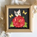 [原画]和紙ちぎり絵『牡丹と蝶と猫』長寿祝いや敬老の日のプレゼントに…富貴耄耋の小さな額装アート