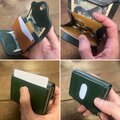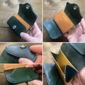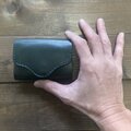 深緑(ブリティッシュレーシンググリーンに近い色味です)の蝋引き革をメイン素材にして内側にはキャメルカラーの姫路レザーを使いターコイズブルーの蝋引き糸で仕上げています。